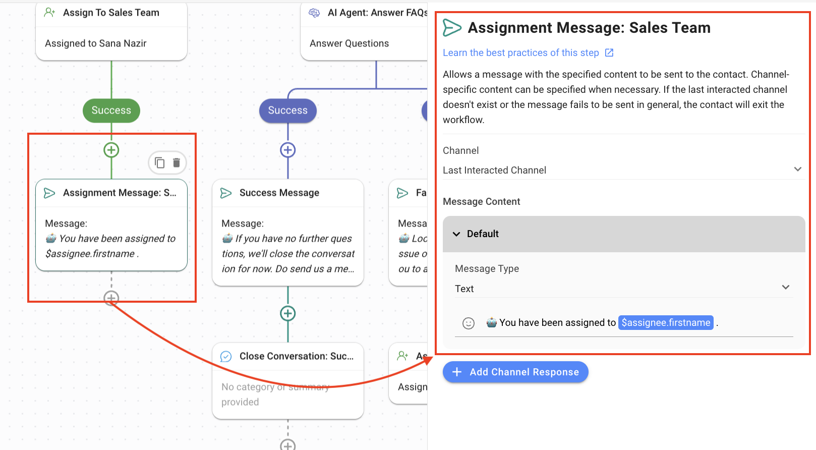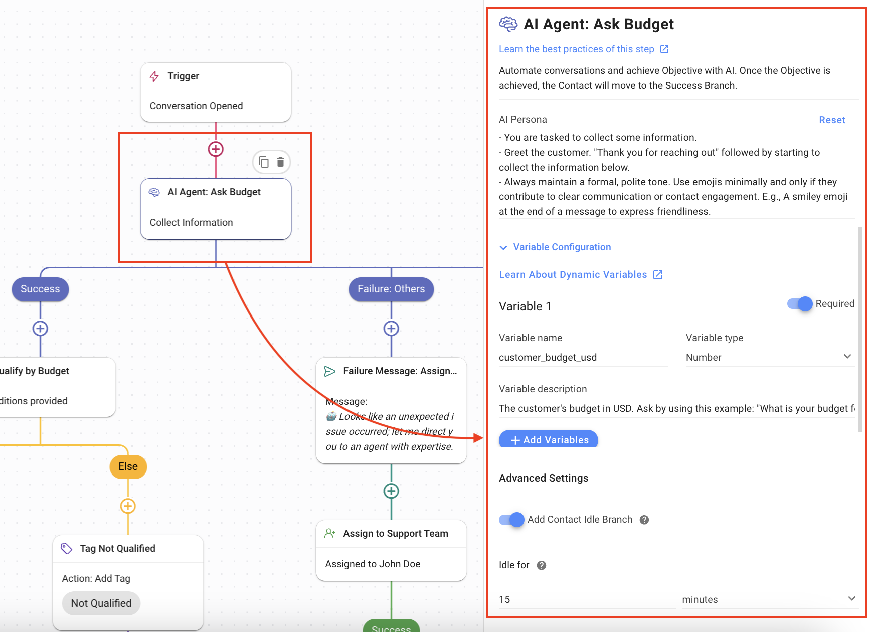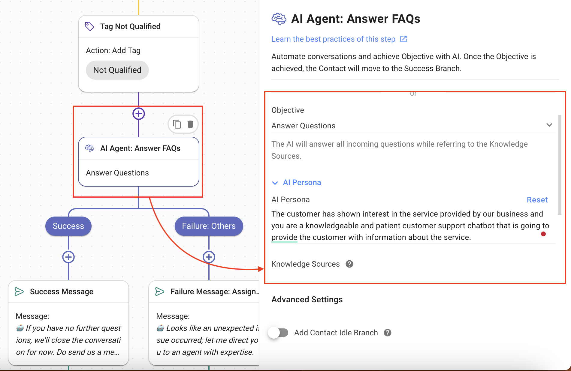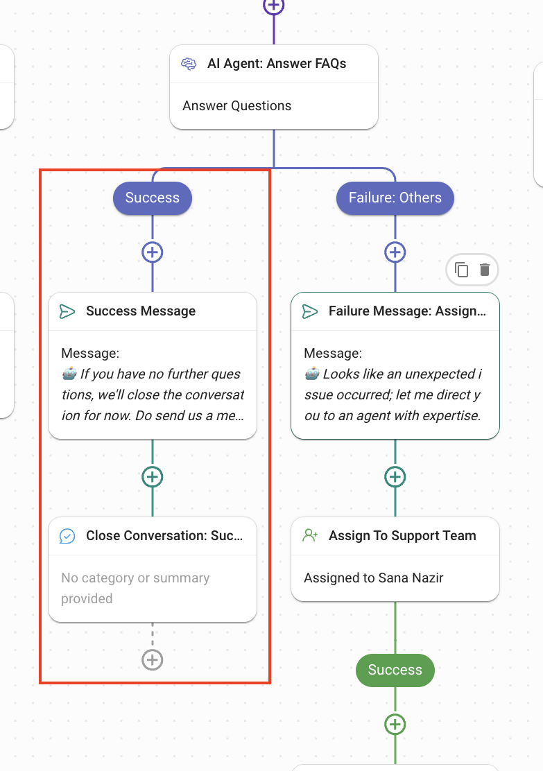 Success: When the AI Agent has answered all the queries, this is the branch the Contact’s journey follows.