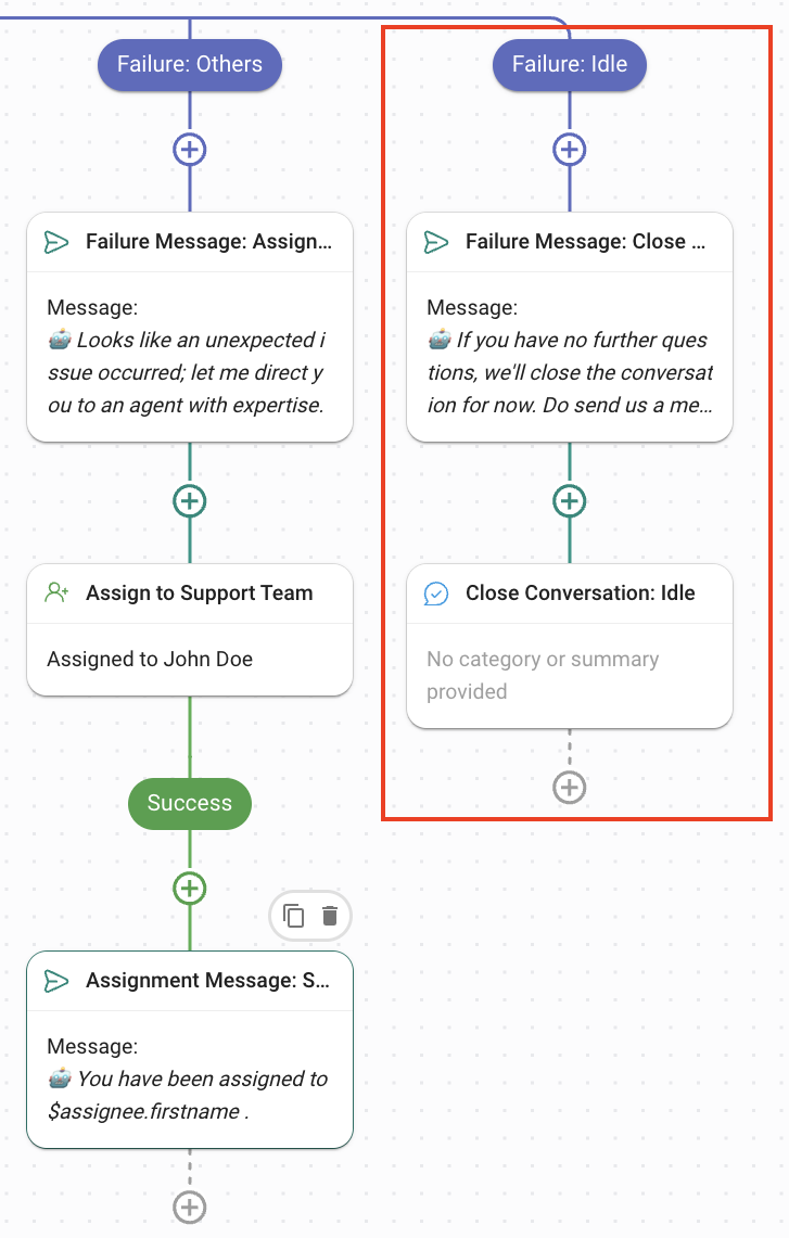 Failure: Idle: The condition for this branch is met when the conversation has been idle for more than 15 minutes. The Contact is sent a message that the conversation is closing because it has been idle, but they can open it again by sending a message.