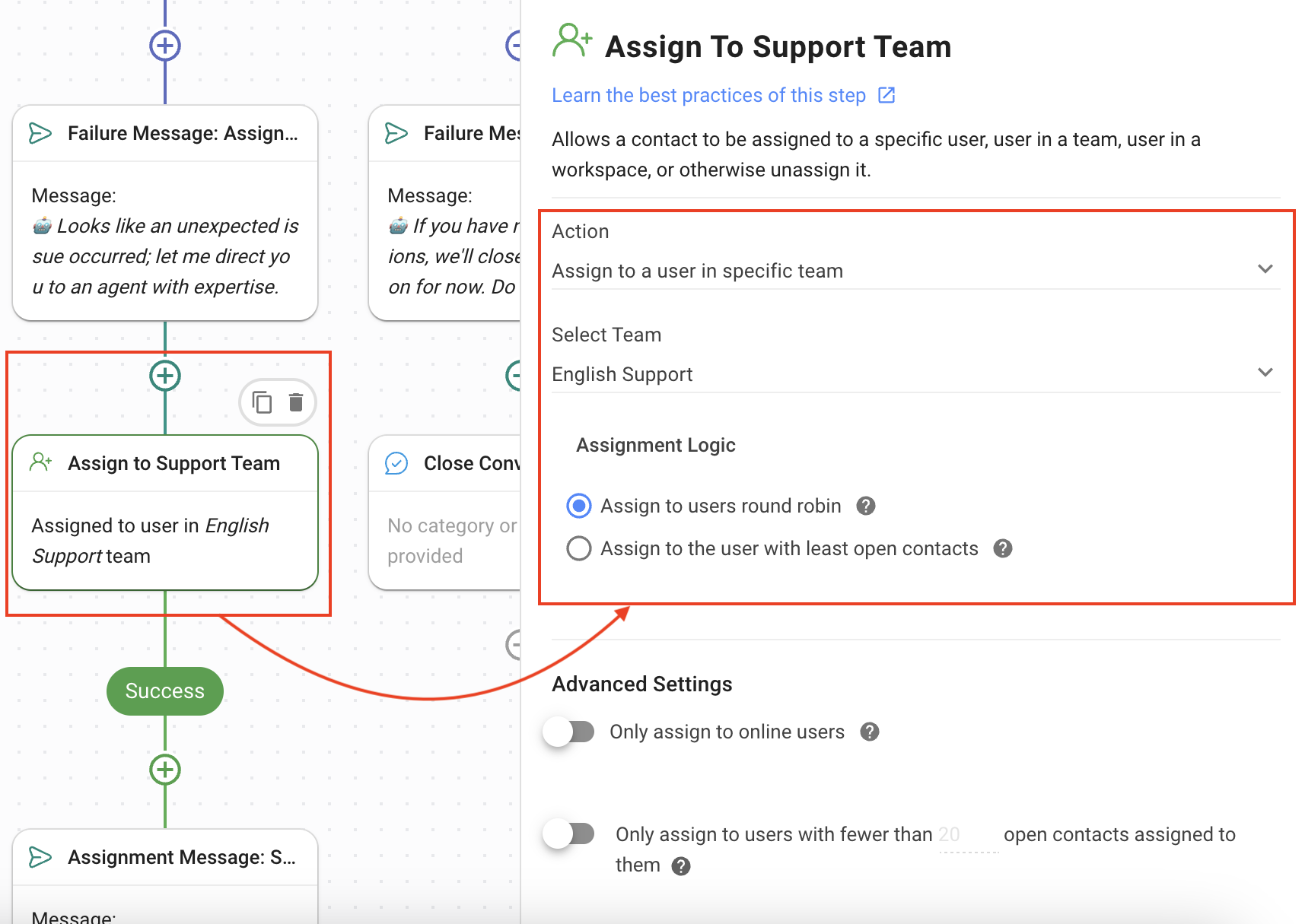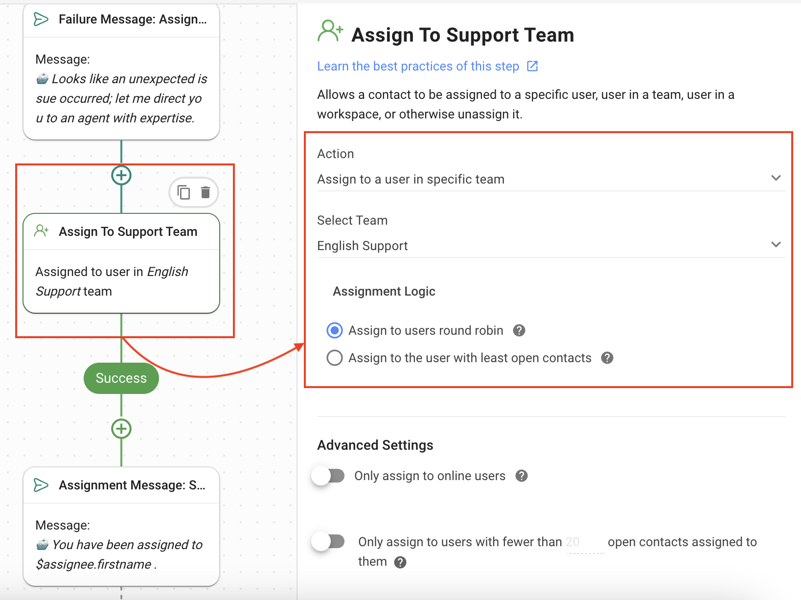 Assign to Support Team: Using the Assign To Step, the Contact is assigned to a support agent.
