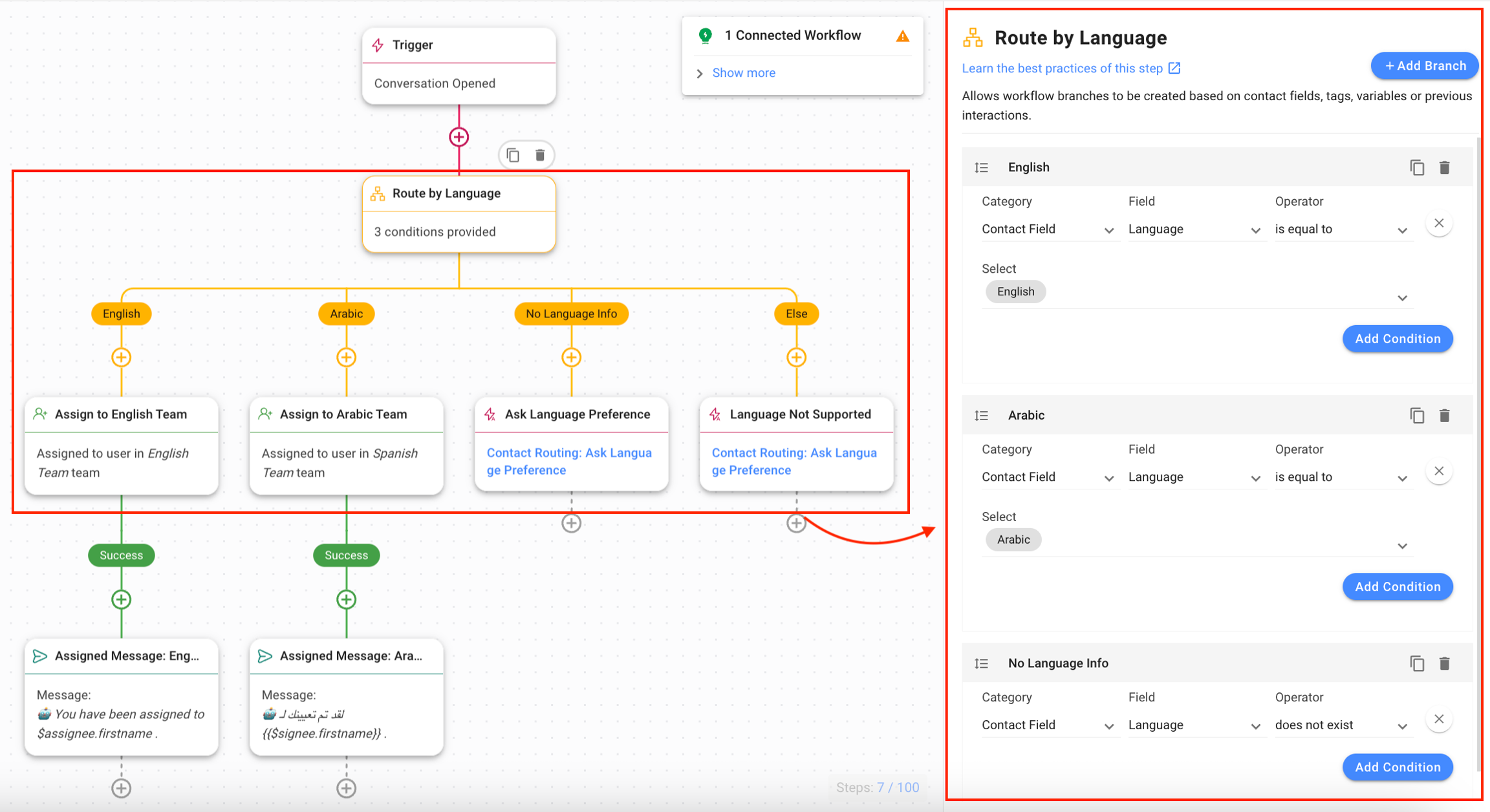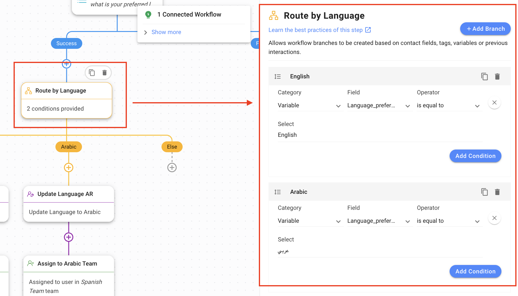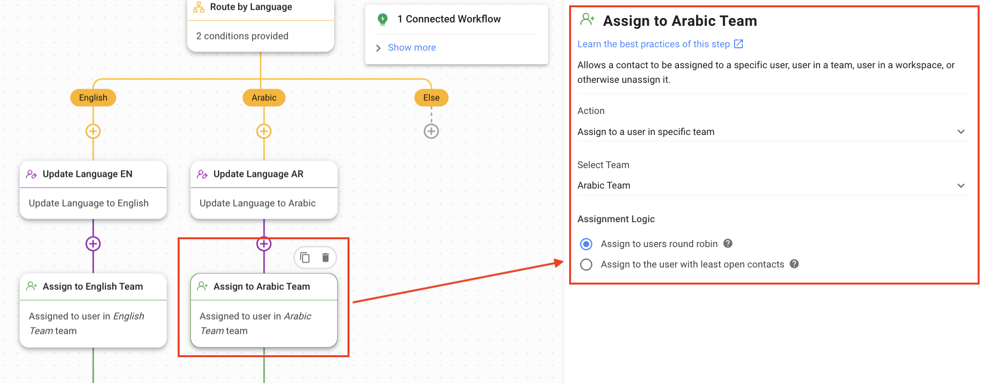 Assign to Arabic Team: In the Arabic branch, this step assigns the Contact to the Arabic Team.