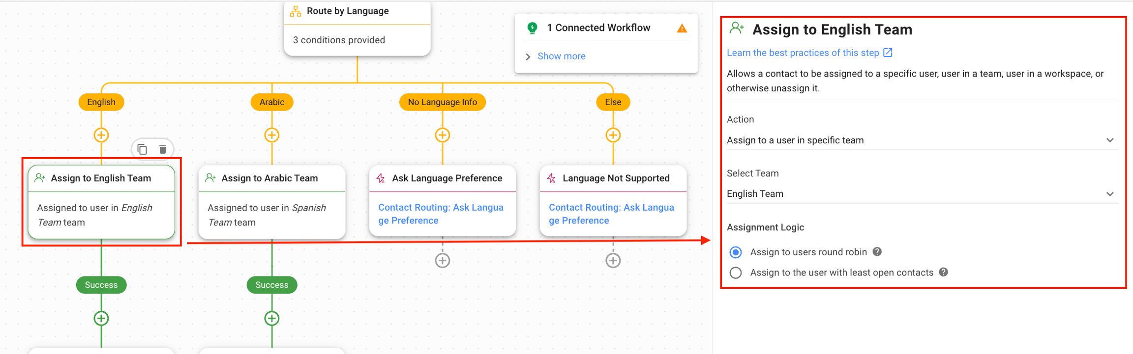 Assign to English Team: In the English branch, this step assigns the Contact to the English Team.