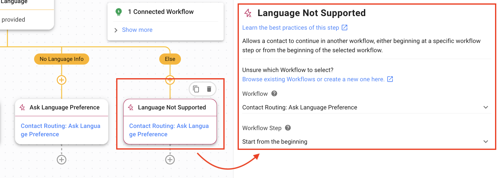 Language Not Supported: In case the Contact’s language is not supported by the platform, the Trigger Another Workflow Step is used to trigger the Contact Routing: Ask Language Preference.