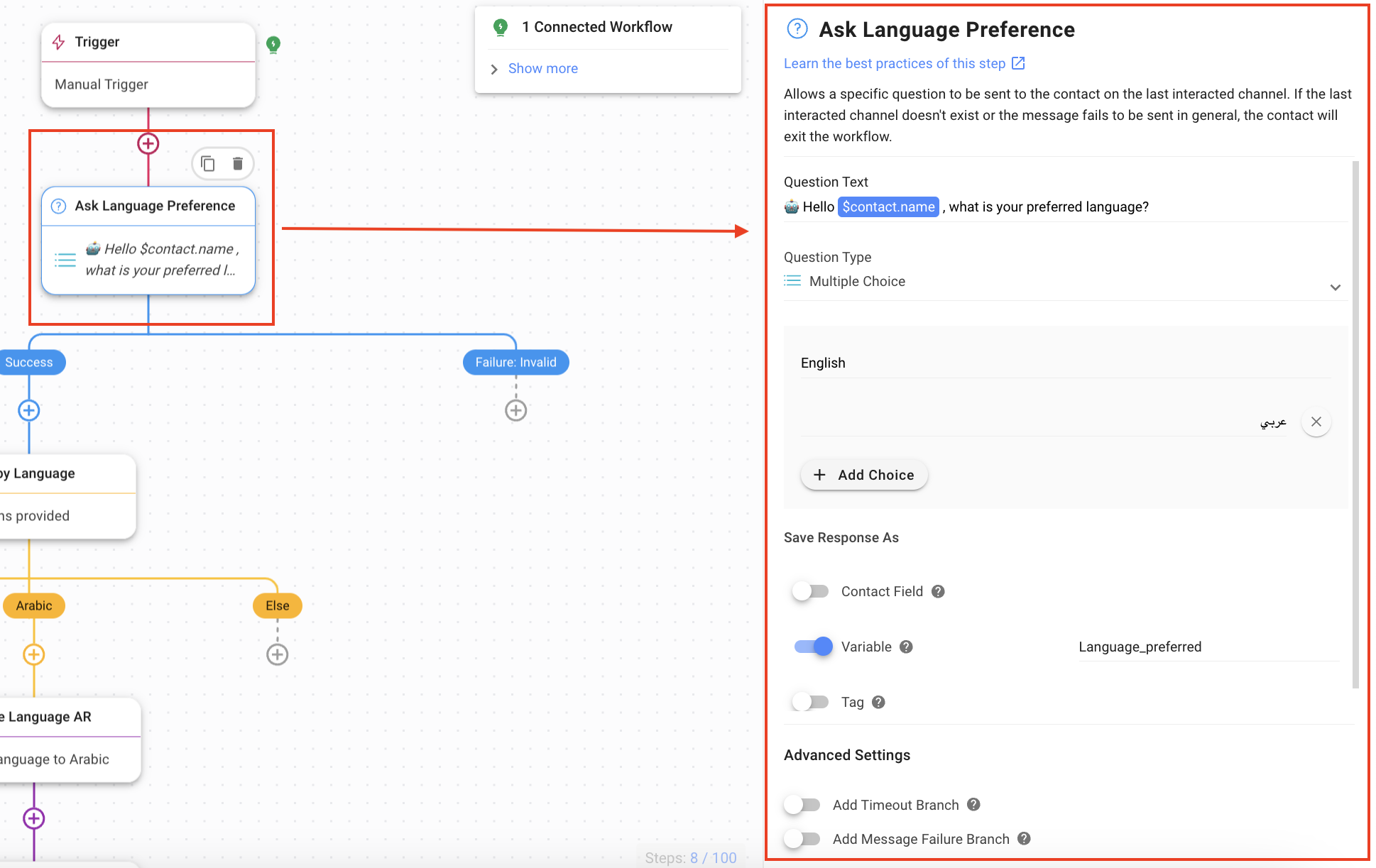 Ask for Language Preferences: The Workflow asks for the Contact’s preferred language using the Ask Step. The following options have been provided in this Workflow template: