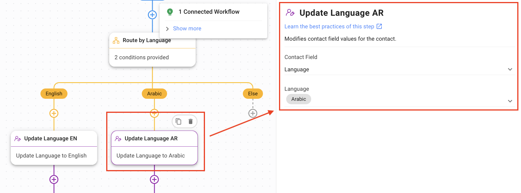Arabic: This branch checks if Contact’s language is Arabic. The following options have been selected: