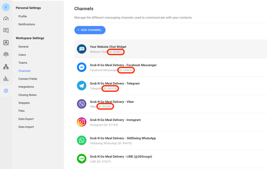To find your Channel ID number, go to Settings > Channels. The Channel ID is under the Channel name in the list.