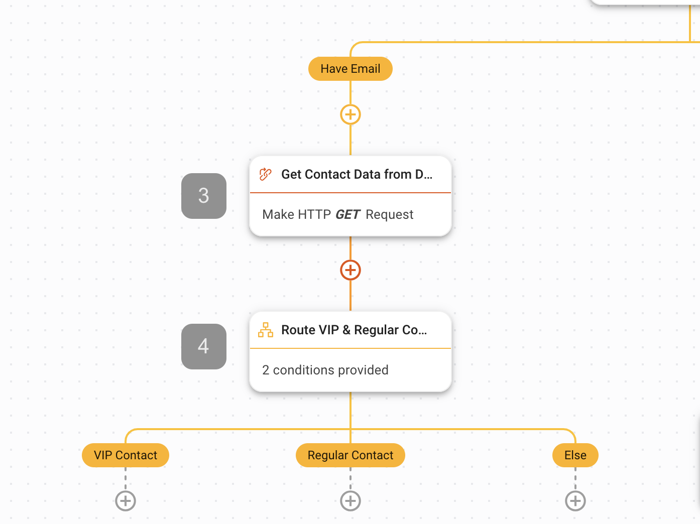 If the Contact has an Email in the Contact’s Email Address field, the Contact will be routed to the Have Email branch. In this branch, the Contact’s data will be retrieved from an external CRM or data warehouse via a HTTP request step to identify if the Contact is a VIP. If the Contact is a VIP, the Contact will be routed to the VIP Contact branch.
