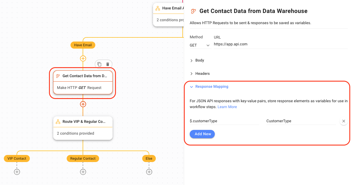 In the Response Mapping section, map the $.customerType(name of key from the response based on your CRM or Data Warehouse) key to store its value as a variable named CustomerType. Learn how to configure HTTP request step here or get a developer to assist with this configuration.