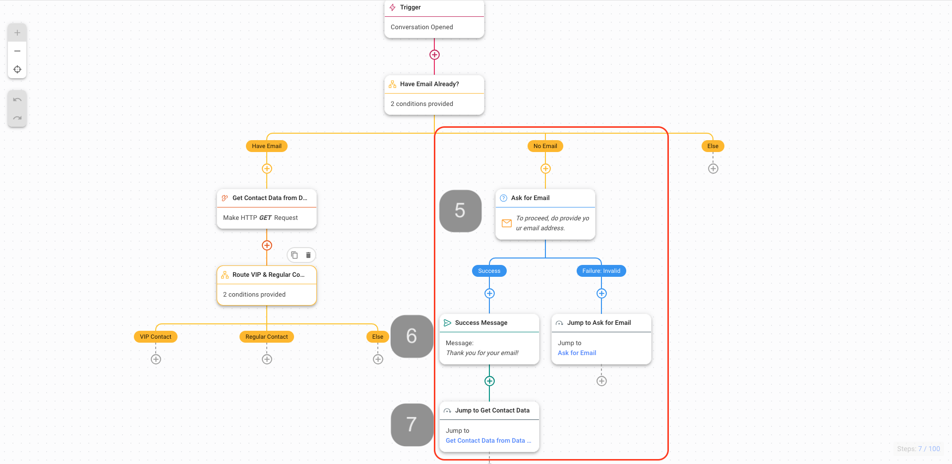 If the Contact does not have an Email in the Contact’s Email Address field, the Contact will be routed to the No Email branch. In this branch, the Contact will be prompted with a question to ask for their email. Once you have received the Contact’s email, a Success Message will be automatically sent and the Workflow will Jump to Get Contact Data where the Contact’s data will be retrieved from an external CRM or data warehouse via a HTTP request step to identify if the Contact is a VIP. If the Contact is a VIP, the Contact will be routed to the VIP Contact branch.