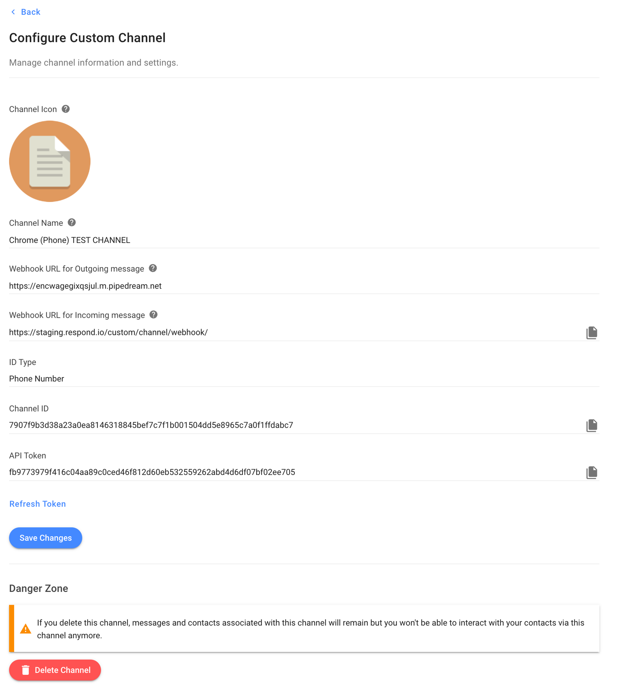 Step 5: The following dialog will provide the Channel ID, API Token, and Webhook URL e.g.