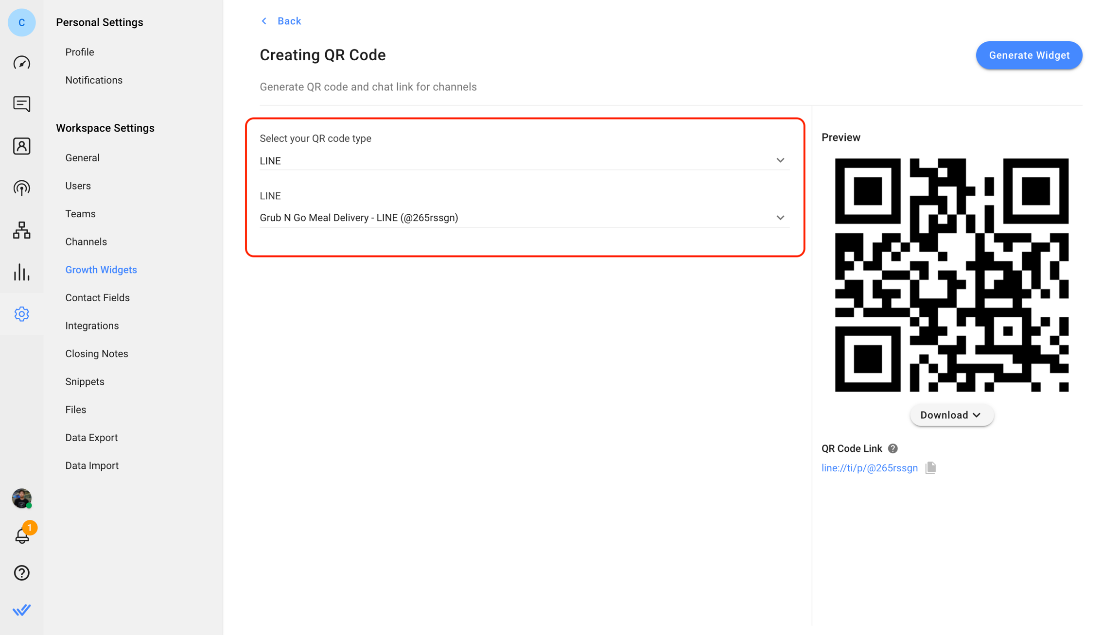 Select "LINE" as the QR code type > Select the connected LINE Channel that you want to create the QR code for.