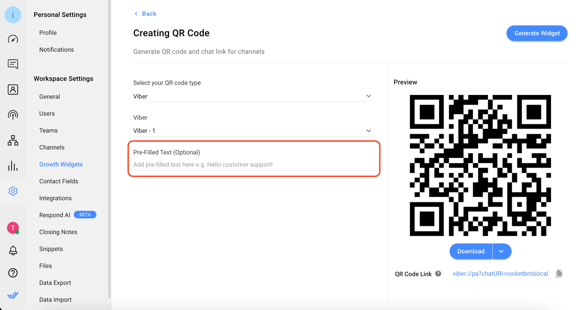 Click Generate Widget button to create your QR code with the pre-filled text.