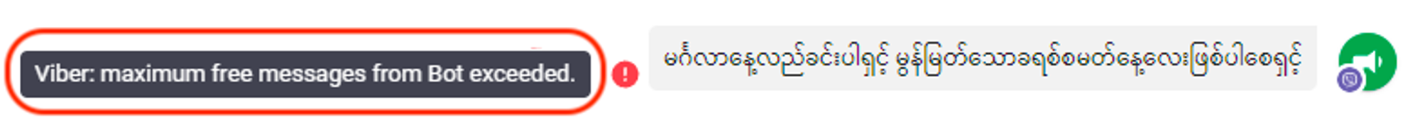 The first is when your account is blocked by Viber. This results in the error message publicAccountBlocked from Viber API being shown when you try and send a message from the platform. If this happens to you, contact Viber Support to unblock your account.