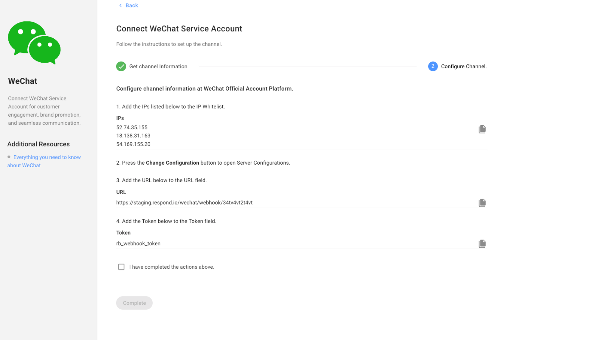 Step 5: Click Complete to complete the setup on the IS-Messenger platform