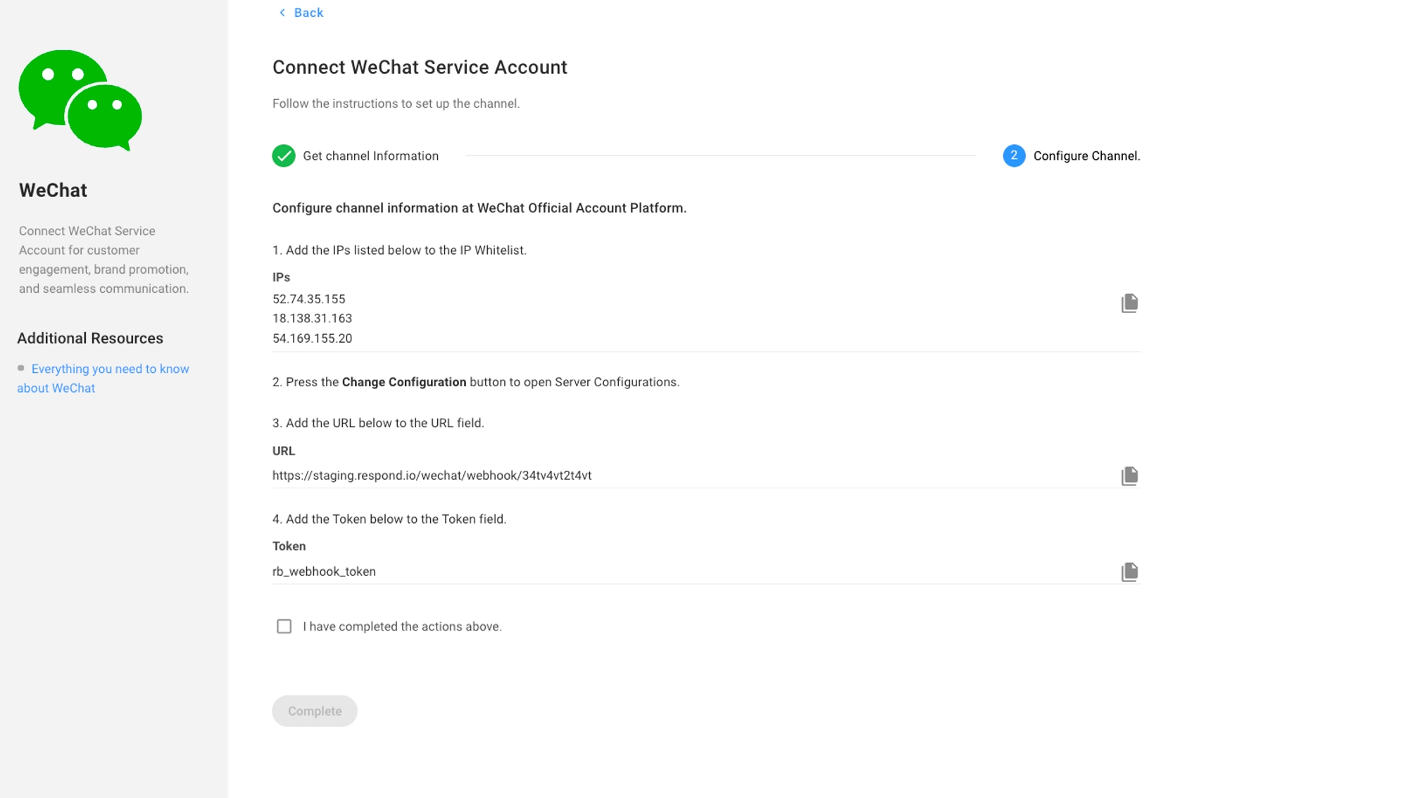 Step 3: In the WeChat Configuration page you will see the following configurations: