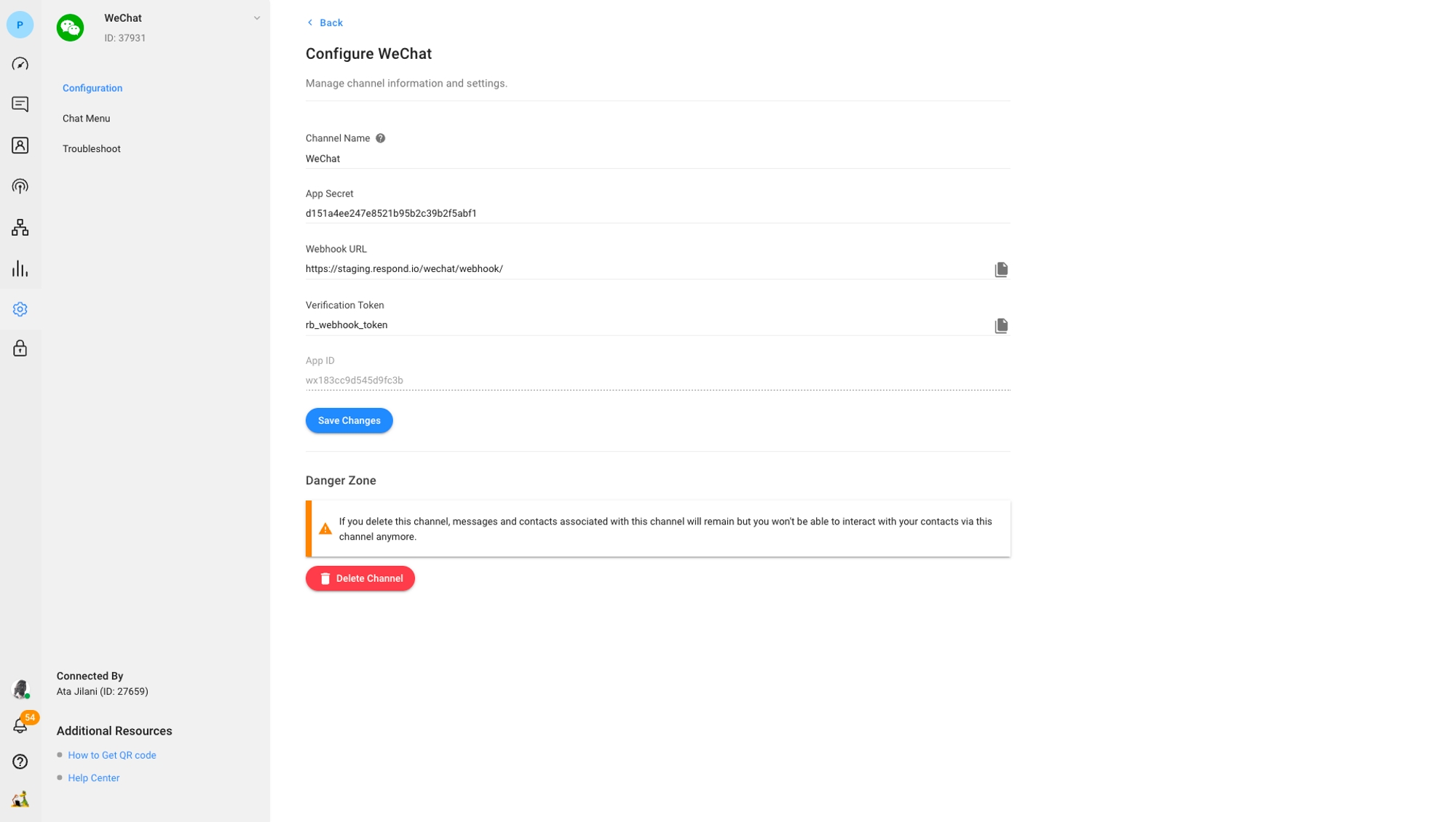 Step 2: Click Add Channel > WeChat > Connect