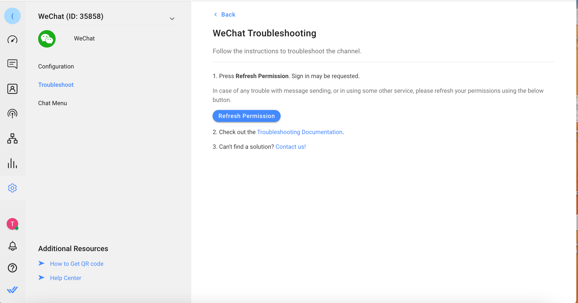 Step 2: Find the WeChat Channel > Manage > Troubleshoot