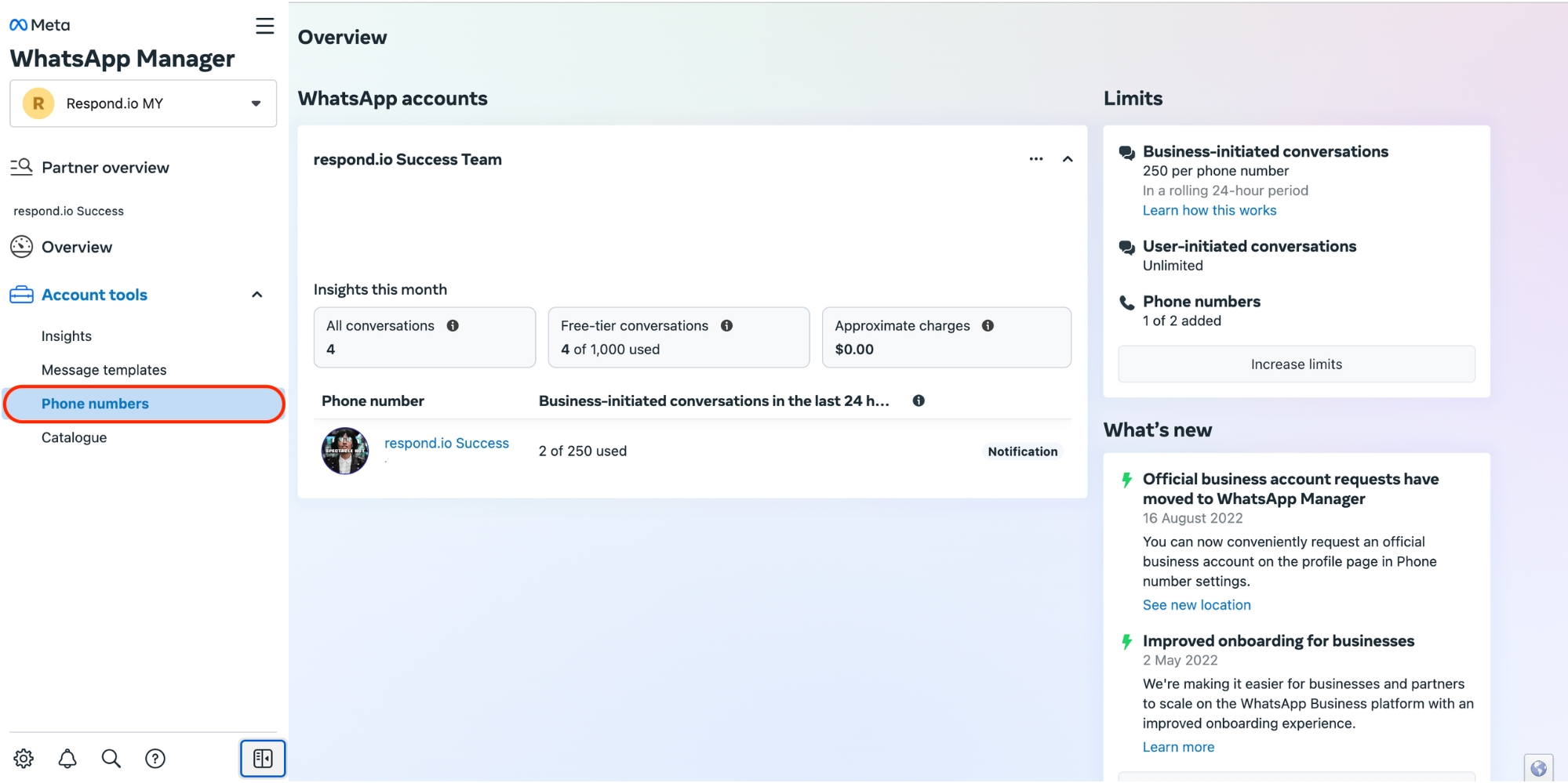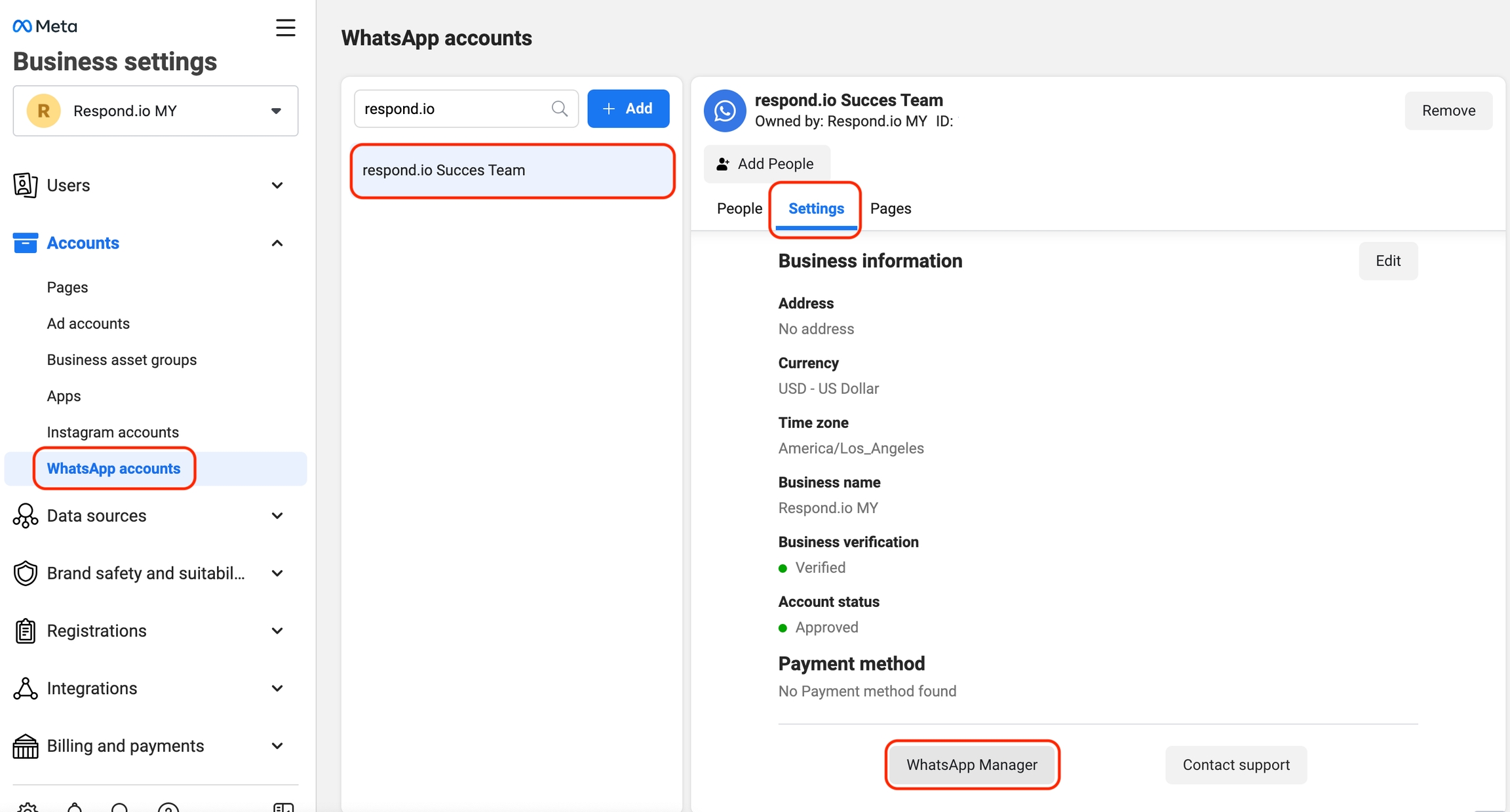 Step 1: Log in to your Meta Business Manager. Go to WhatsApp Accounts > Select your account > Settings tab > Click on WhatsApp Manager