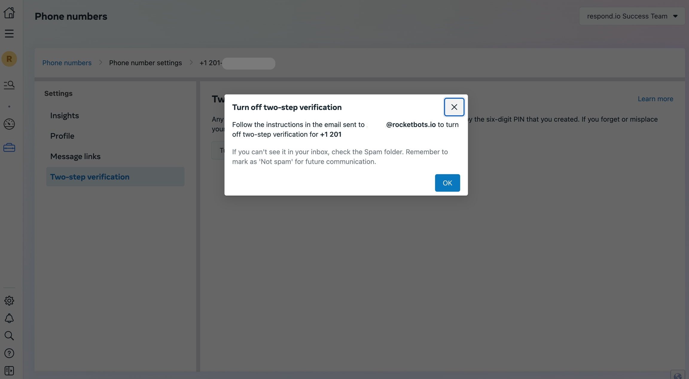 Step 6: Click on the link in your email to turn off two-step verification for your number.