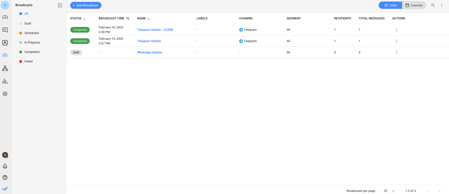 In the Table view, you can see all broadcasts, including past and scheduled ones.