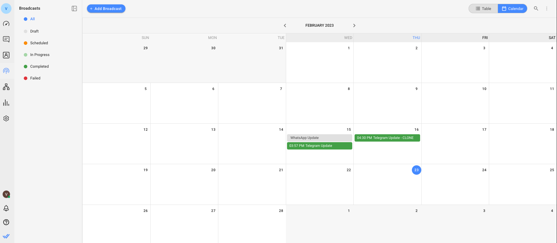 In the Calendar view, you can see all broadcasts for the current month, including past broadcasts and scheduled broadcasts. Use the arrows next to the month to navigate to other months. If a broadcast is in Draft status without a delivery time set, it will be shown on its created date.