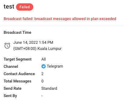 An indicator will be shown beside the broadcast name if the broadcast is not sent successfully due to insufficient broadcast message usage.