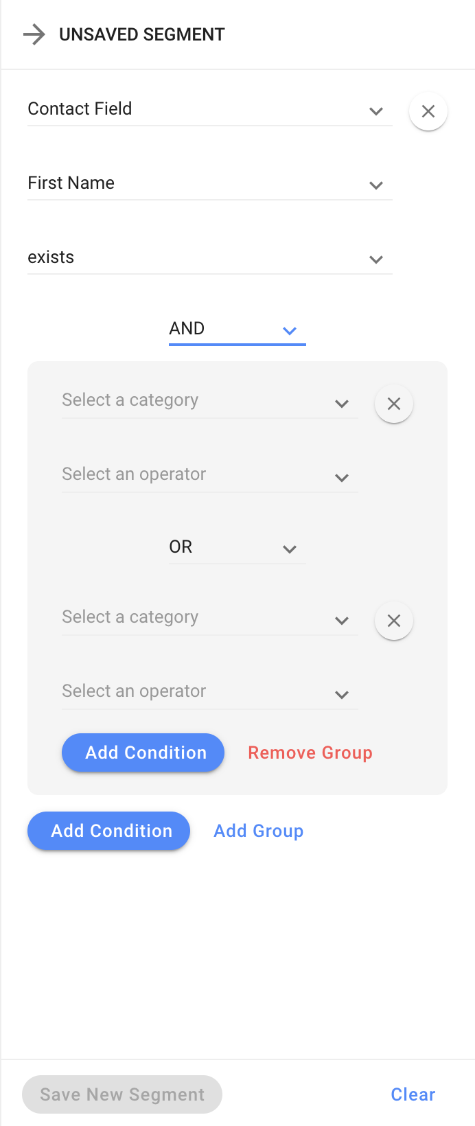 Segments are located on the left side of the Contacts module. Use Segments to group Contacts based on specific criteria and filters.