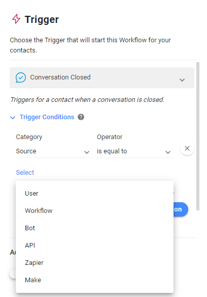 Adding conditions to the conversation close trigger is optional. If no conditions are added, the workflow will trigger whenever a conversation is closed no matter the source.