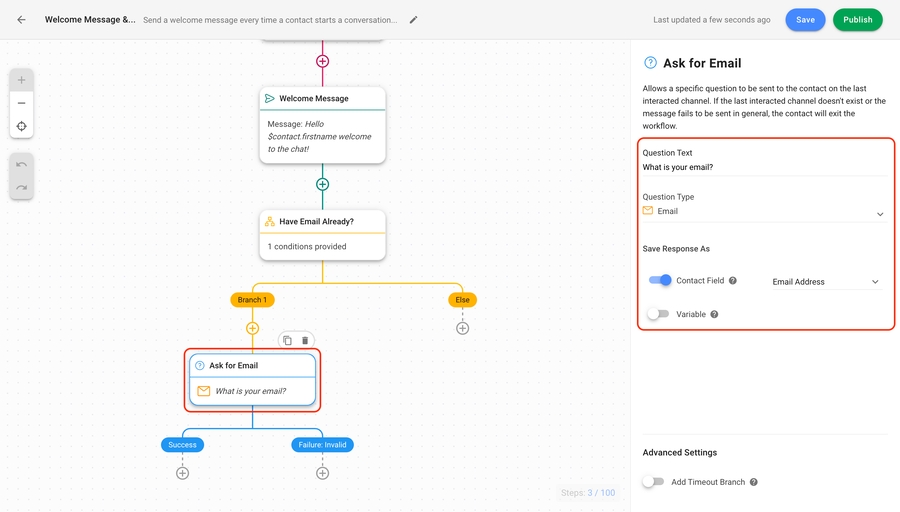 Then, customize the Welcome Message & Ask a Question Step as desired.