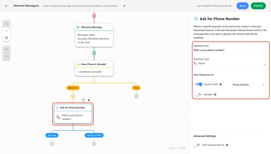 To collect phone numbers, click Welcome Message & Ask For Phone Number > Use Template.