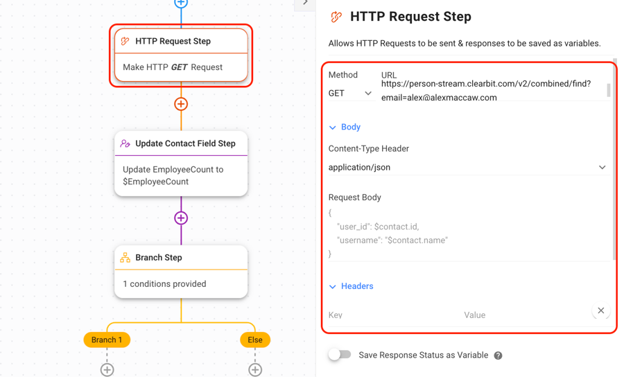 The HTTP Request step is used to retrieve additional Contact information from database software.