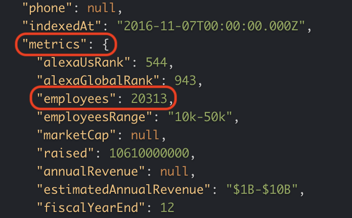 In order to map the retrieved data, you'll need to know what the response looks like. The response code looks like this in Clearbit. It may be slightly different in other database software like ZoomInfo, but the process is similar. To see what your specific response looks like, send the request in Postman.