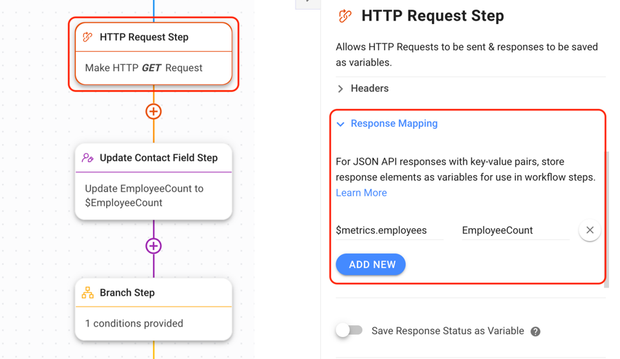 In the HTTP Request configuration panel, expand the Response Mapping toggle, add $metrics.employees in the JSON Key field and give it a Variable name