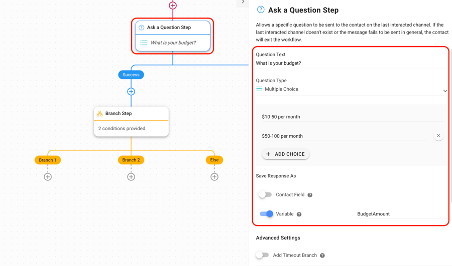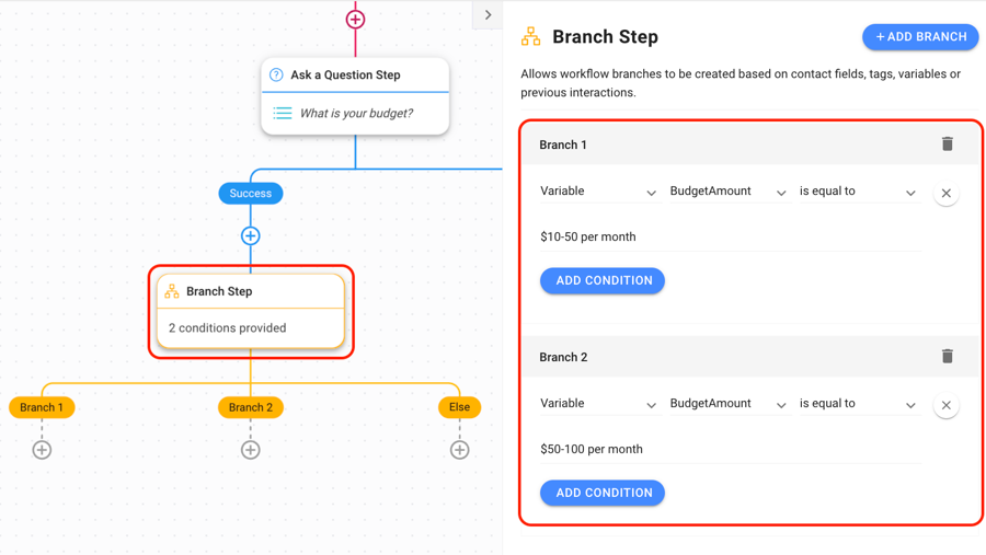 Use the Branch Step to route leads to the next Workflow step based on their answers. In this example, we’re using the BudgetAmount Variable as a condition.