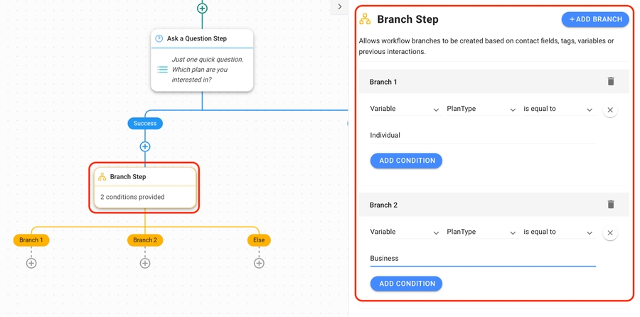 Use a Branch Step to route leads to the right team or agent based on their answers. Since we saved the above example Variable as PlanType and we have two plans, Individual and Business, we’re adding a branch for each answer.