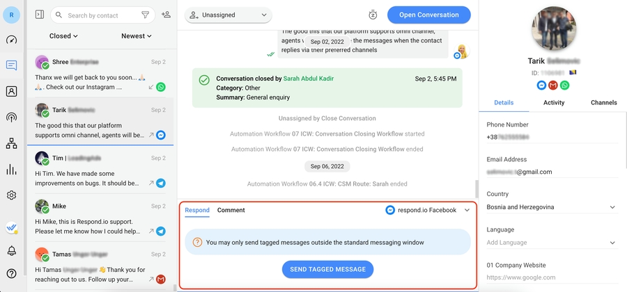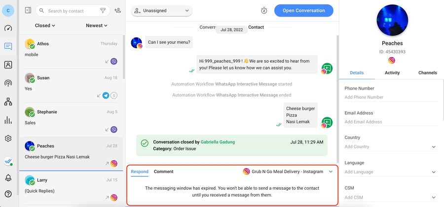 The ability to reopen a conversation differs among Channels. Most Channels allow you to send outbound messages anytime, some Channels have a messaging window with limitations, while some Channels do not allow you to message leads after the messaging window closes.