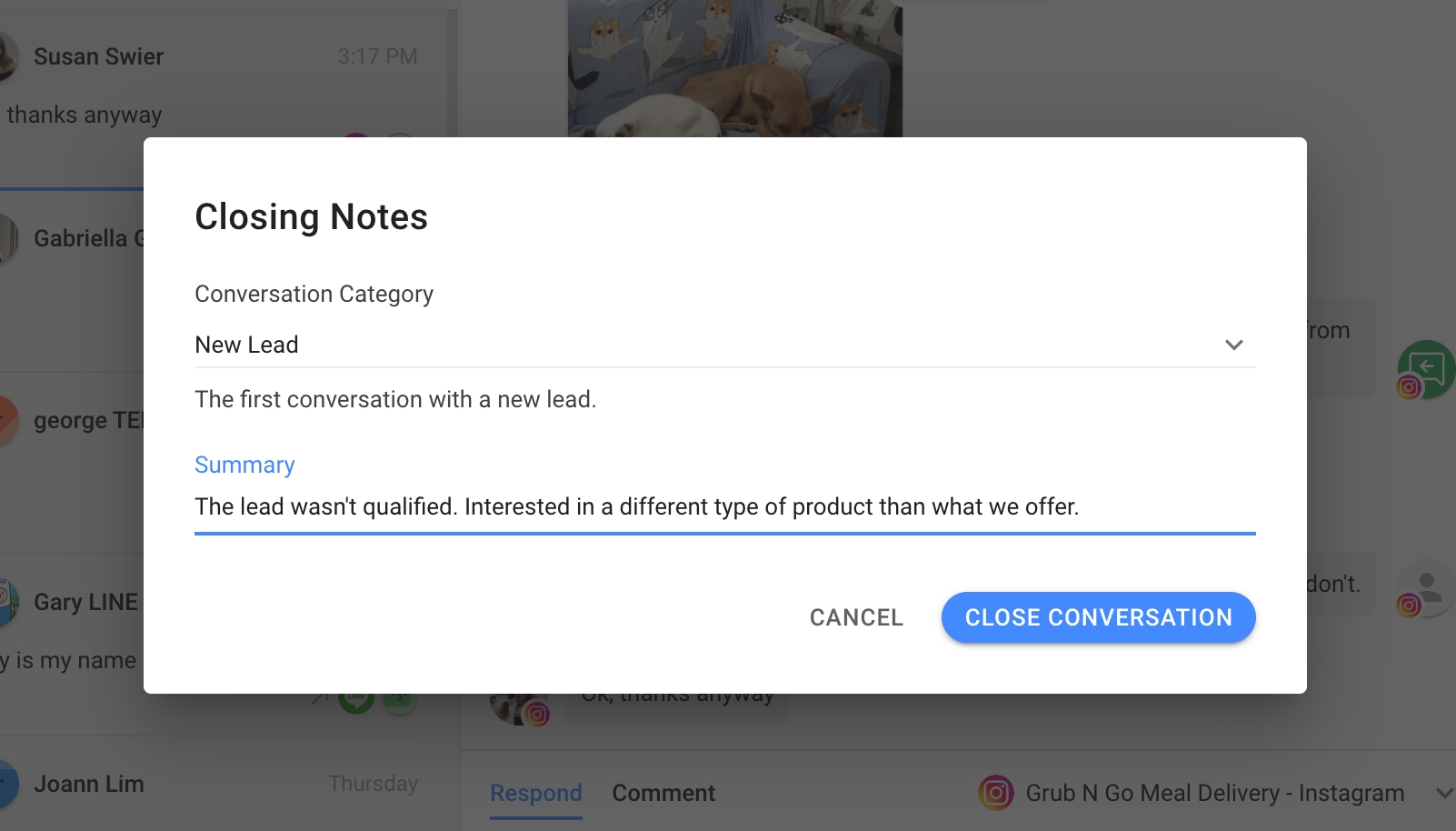 To close a conversation with a lead, use the Close Conversation button on top and add an optional Closing Note to provide a summary of the conversation.