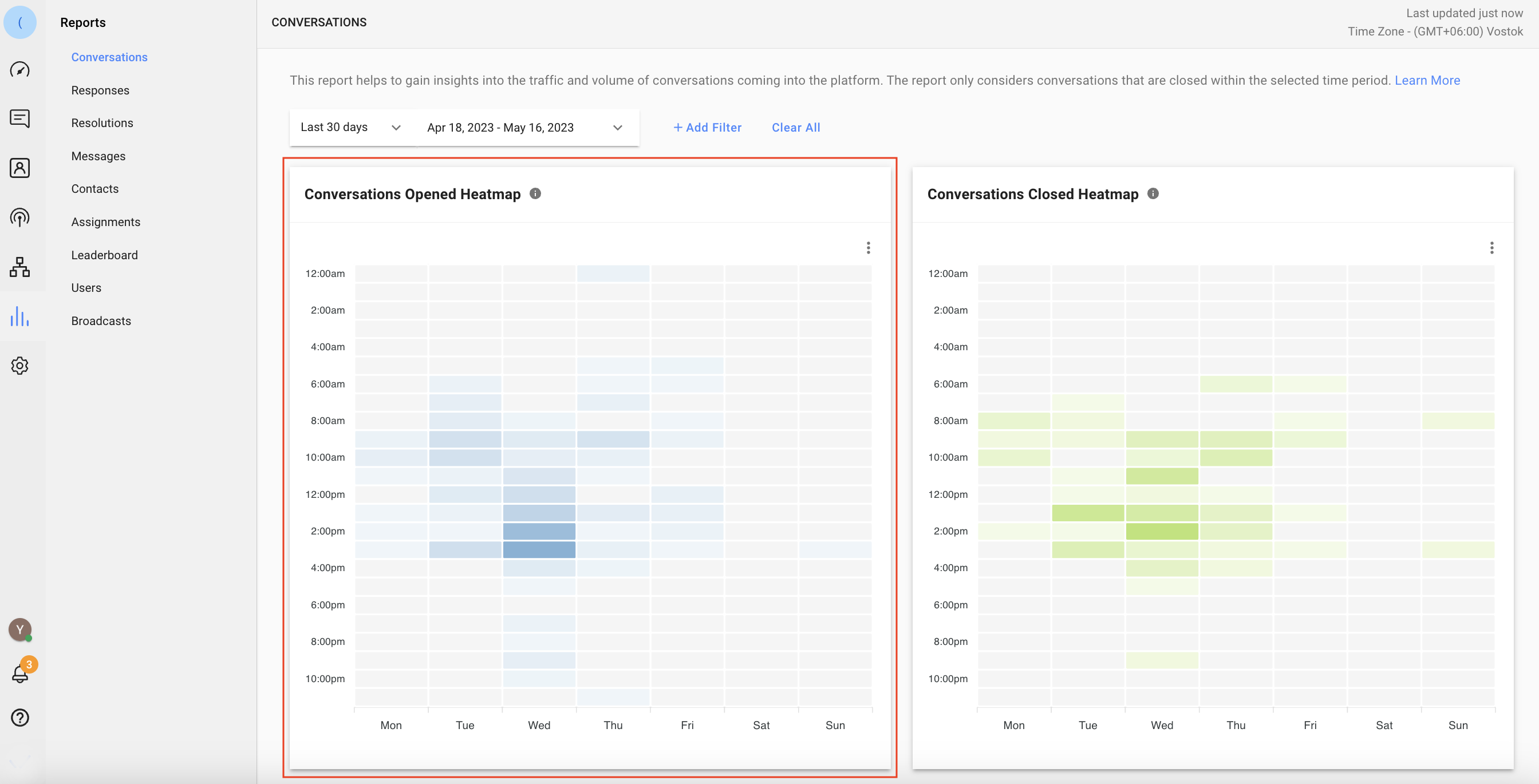 Go to Reports module > Conversations > Conversations Opened Heatmap.