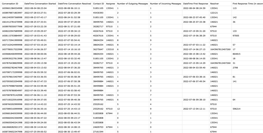Support managers can use this list to evaluate the quality of conversations with customers by analyzing the columns available here. For example, if a conversation has a long Resolution Time with high number of Messages, you'll want to investigate if this was an uncommon issue or if the agent requires more training on an existing issue.