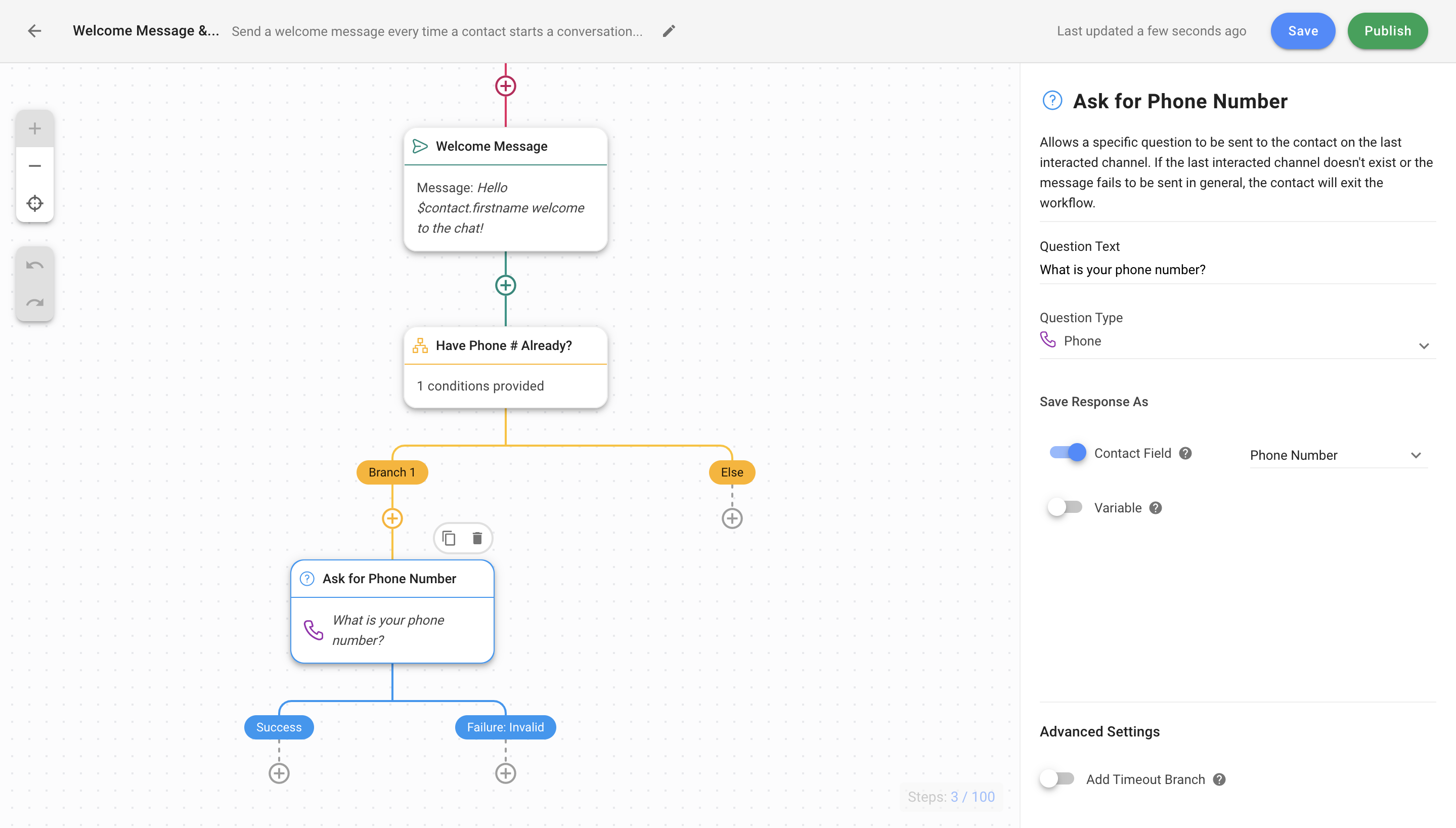 Click the **Ask for Phone Number** step to edit the **Question Text**. The **Question Type** should remain as Phone. Finally, click **Save** and **Publish** to activate the Workflow.