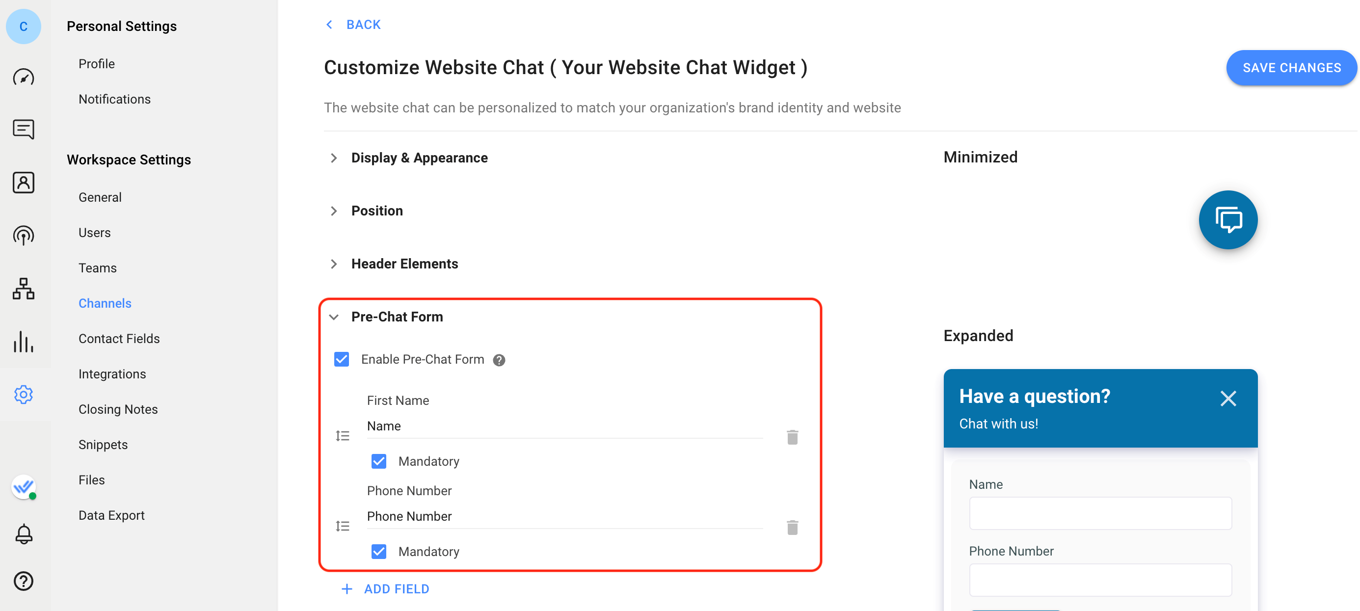 1. Open the Pre-Chat toggle and enable Pre-Chat Form.