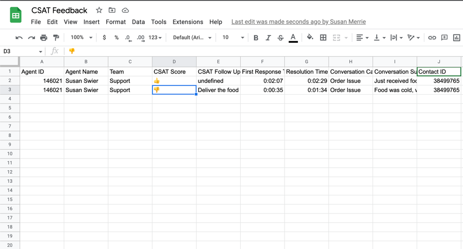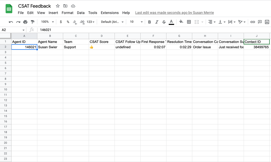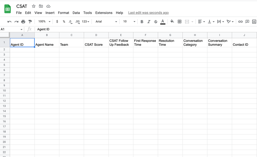 Create a Google Sheet with the following headings: Agent ID, Agent Name, Team, CSAT Score, CSAT Follow Up Feedback, First Response Time, Resolution Time, Conversation Category, Conversation Summary, Contact ID.