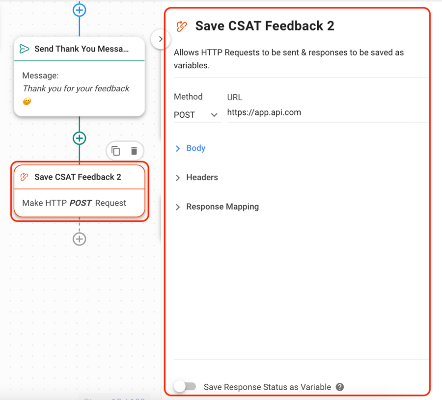 If no feedback is given, the Fail Message will be sent, and all the data except CSAT Follow Up Feedback will be saved. Configure Save CSAT Feedback 3 step exactly as done for the first two CSAT Feedback steps.