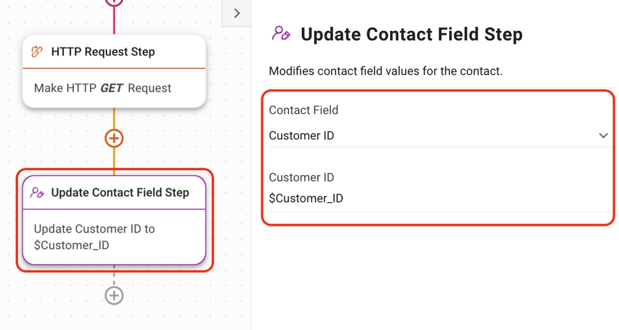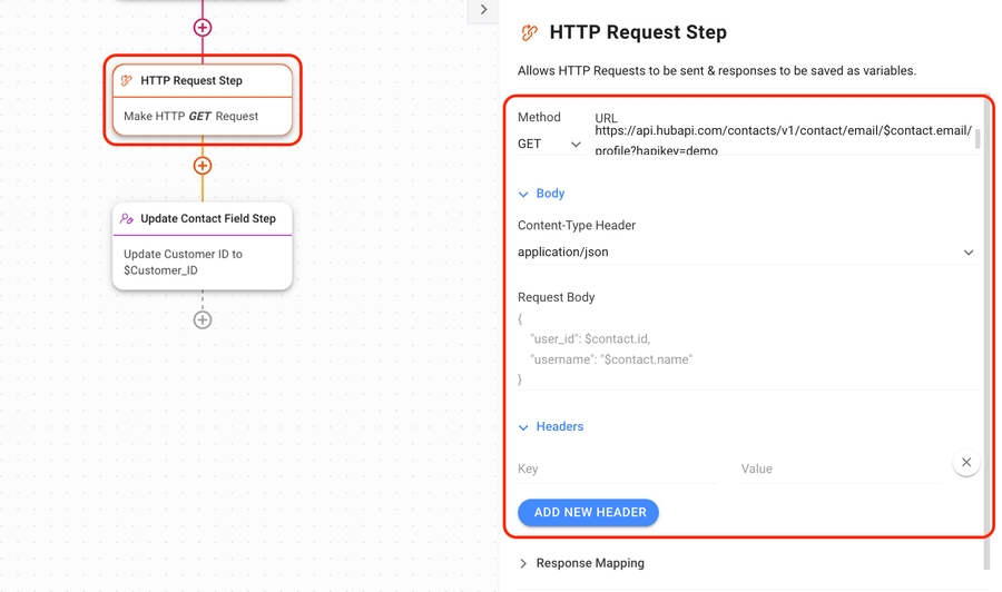 Use the HTTP Request Step to provide the Contact’s identifier to your CRM or business software. In this example, we’ll use Email as the Contact’s identifier. Keep in mind, your CRM may use Email, Phone Number or some other identifier.