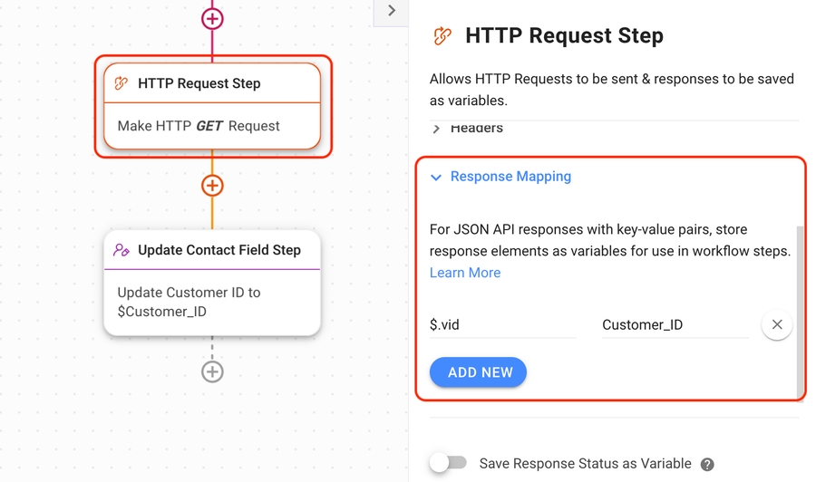 Response Mapping is used to save the information you get from the CRM as a Variable. The Variable can later be used to update the Contact’s field on IS-Messenger. This example will show you how to save the Customer ID field as a Variable.