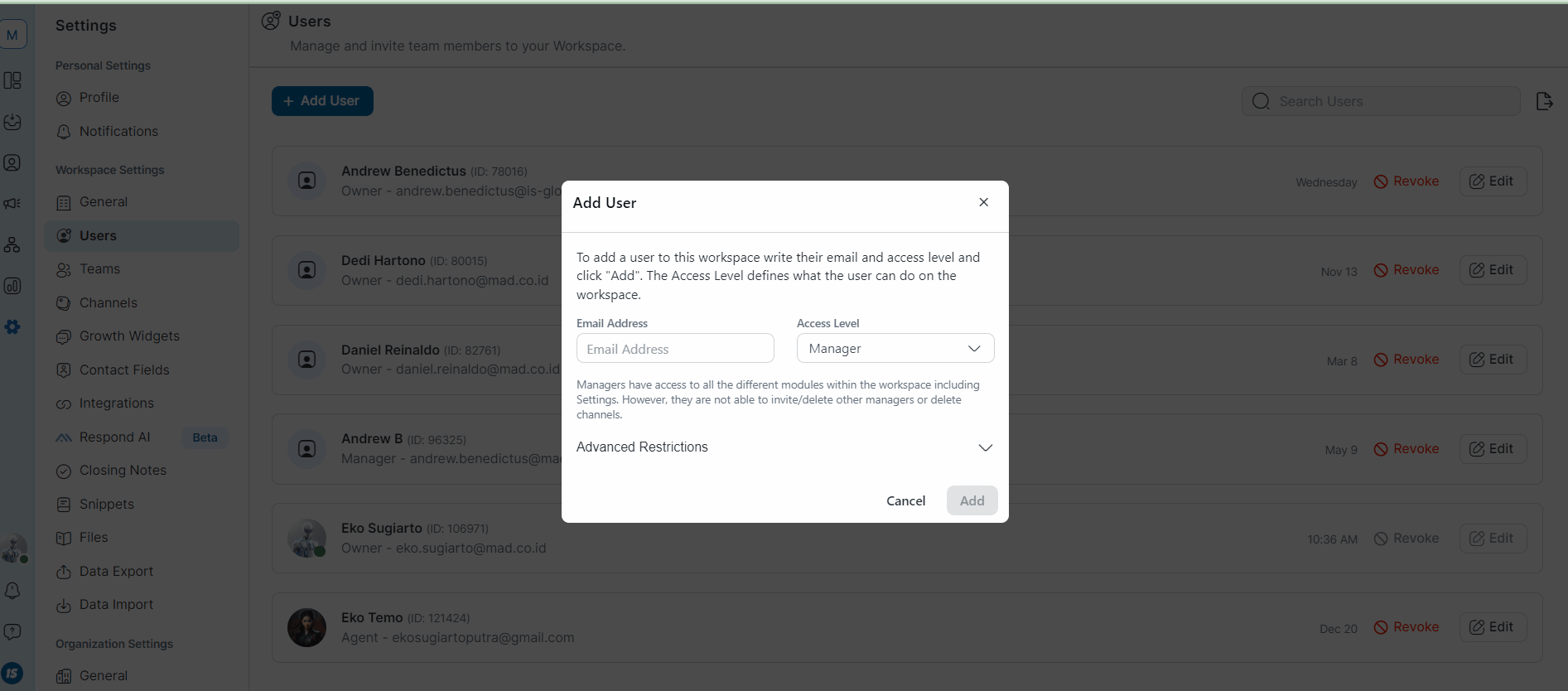 **Access to Workspace Settings -** Managers with this restriction cannot access the Workspace Settings. Therefore, they won't be able to manage or change the settings. They also cannot add or delete Channels. To do so, the Owner access level is required.