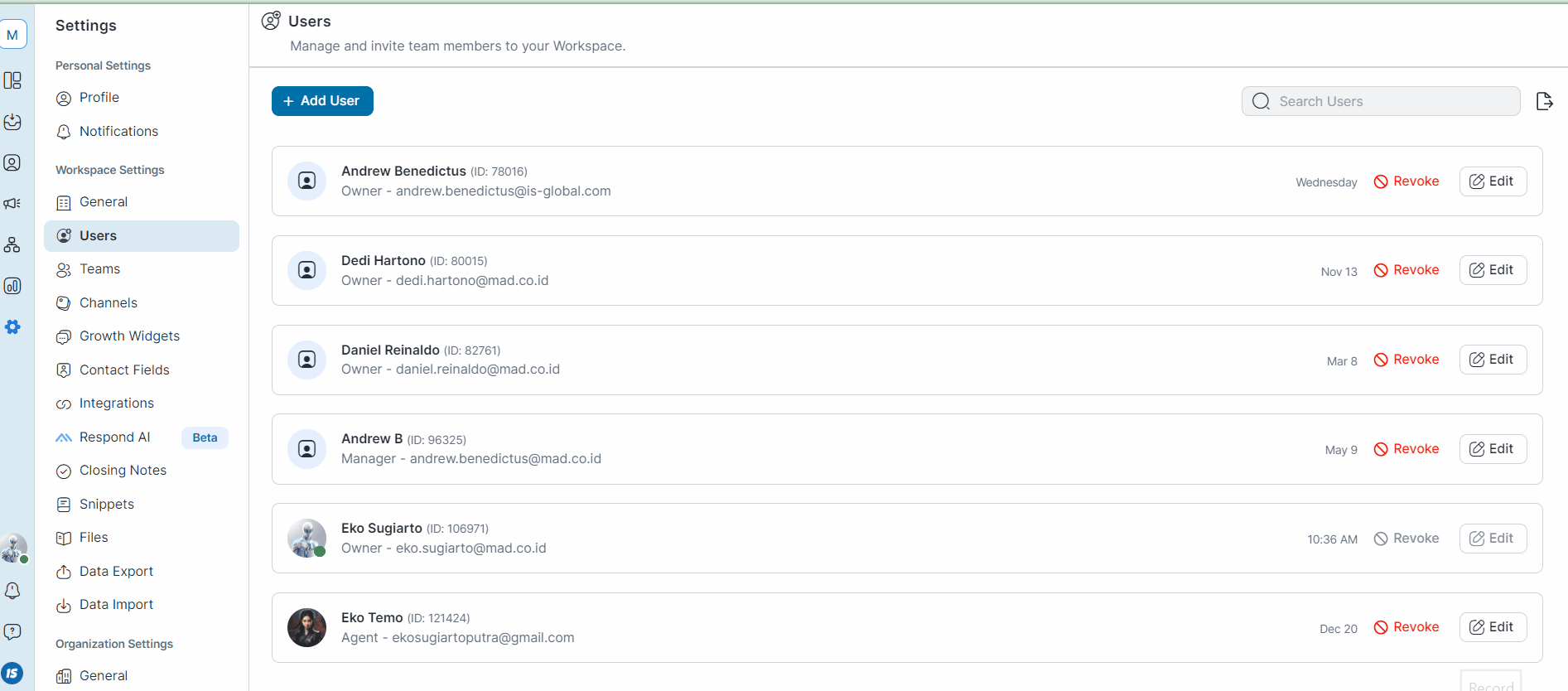 Learn how to [add a new user here](https://docs.is-messenger.com/ismessenger/workspace-setting). If an email is obsolete, you can [delete the user by following the instructions here](https://docs.is-messenger.com/ismessenger/workspace-setting).